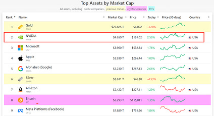 Il primo è senza dubbio Nvidia, che negli ultimi due anni è diventata una leggenda, sorpassando le altre 6 top aziende USA e salendo addirittura alla seconda posizione degli asset più capitalizzati al mondo (seconda solo all’oro).