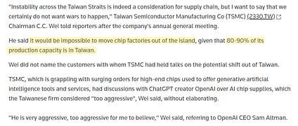 se la Cina prendesse Taiwan, TSMC non potrebbe continuare a produrre per l’Occidente.